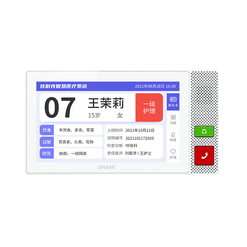 安裝在病床頭的交互設備機,代替?zhèn)鹘y(tǒng)紙質卡。產(chǎn)品支持呼叫對講、為住院患者提供病例查詢、狀態(tài)自動提醒等護理需求等。