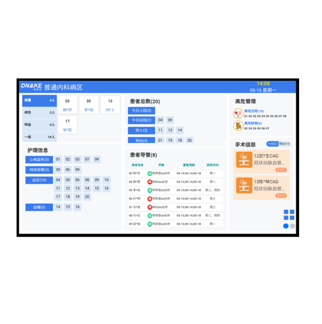 創(chuàng)新主要部署于病區(qū)護(hù)士站,用于顯示區(qū)域病房內(nèi)病床相關(guān)信息,并對報警情況做出相對顏色塊提醒,同時伴隨醫(yī)護(hù)值班情況及安排等操作??娠@示科室病房的住院人數(shù)、空閑床位數(shù)、護(hù)理等級人數(shù)、護(hù)理交接班情況、值班的醫(yī)護(hù)人員以及要事留言,完全取代傳統(tǒng)記事板。軟件參數(shù):支持顯示出入院統(tǒng)計、 根據(jù)護(hù)理等級分類查詢不同患者的床位數(shù)和總?cè)藬?shù)、支持護(hù)理信息查詢不同床位、支持患者導(dǎo)管信息查詢